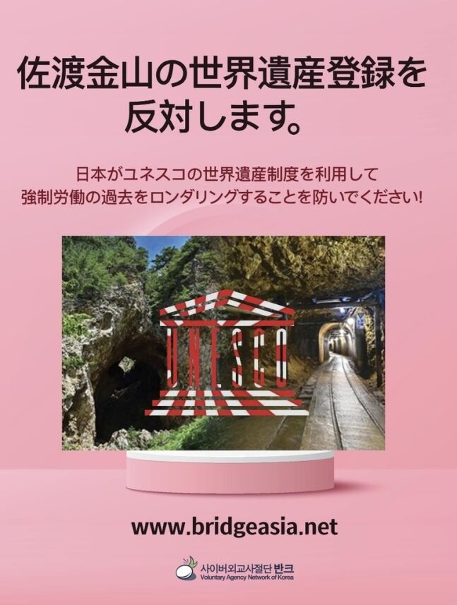 韓国外交関連市民団体バンクは佐渡金山の国連教育科学文化機関(ユネスコ)登録を日本人が阻止してほしいというポスターを製作して10日、SNSに配布した。