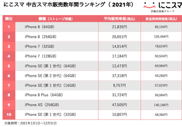 《「にこスマ」2021年1月~12月の中古iPhone/機種別年間販売数ランキング》