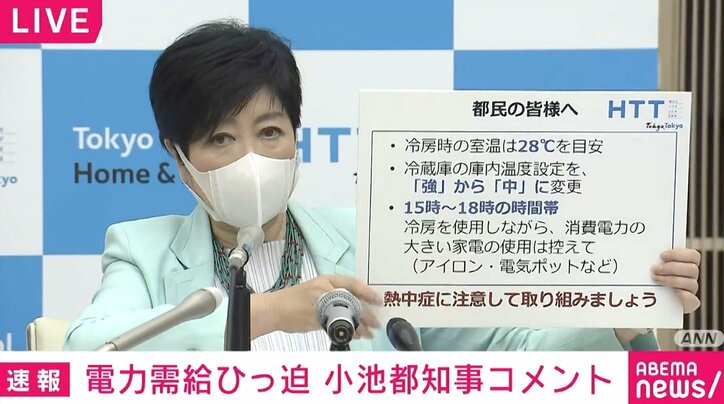 こうした事態を受けて、東京都の小池知事は27日午前の会見で、「暑い時間帯には適切に冷房などは活用していただいて、熱中症にならないよう十分にご注意をしていただきたい。一方で、国が示しているのは夕方15時から18時の時間帯。冷房などの適切な活用、使っていない照明を消すなどの節電をお願いする」と、都民へ向けて節電などへの協力を呼びかけた。