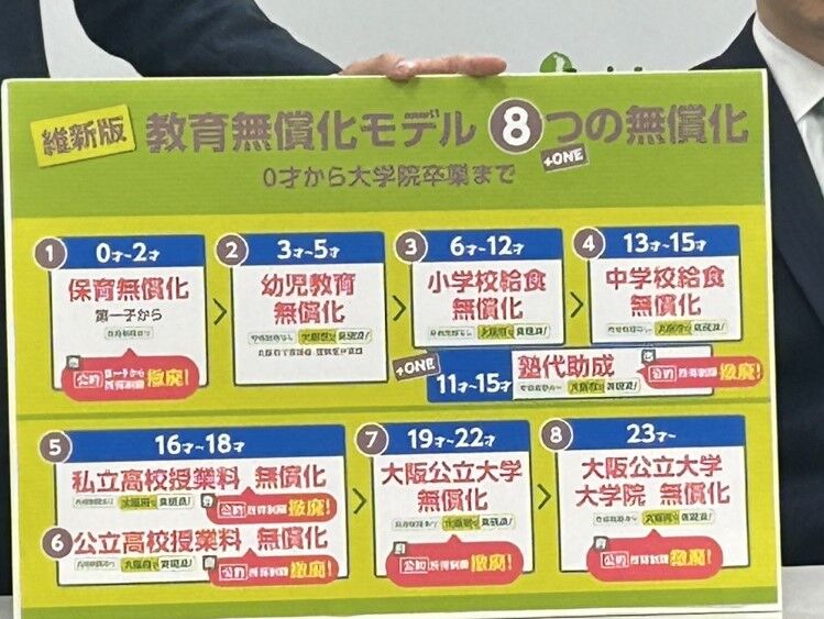 吉村氏は同様に、高校授業料の完全無償化を公約に掲げる方針を示している。さらに大阪市では現在所得制限がある0~2歳児の保育無償化、小学5年~中学3年の塾代助成についても所得制限を撤廃することを公約にするとし、国の制度と合わせて「0歳から大学院卒業までの世代で教育の無償化を実現する」と語った。