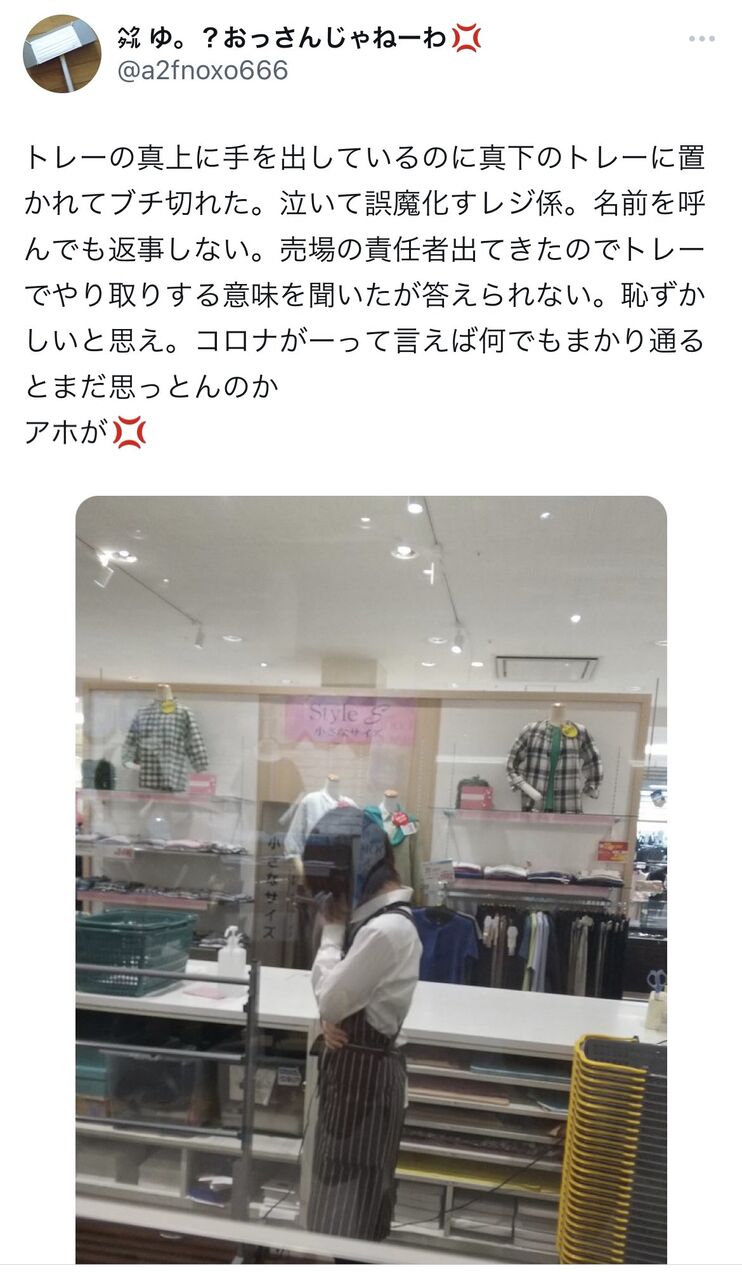 店員は、お釣りを手渡ししなかった理由について、「嫌がるお客さんもいるから」などと説明したという。激怒されて泣き出した店員は、名前を呼んでも返事せず、「おいお前!聞こえていますかぁ~?」と何回も聞いたが、「はい」と言わなかったという。売場の責任者が出てきたため、トレーでやり取りする意味を聞いたが、この責任者は答えられなかったとした。