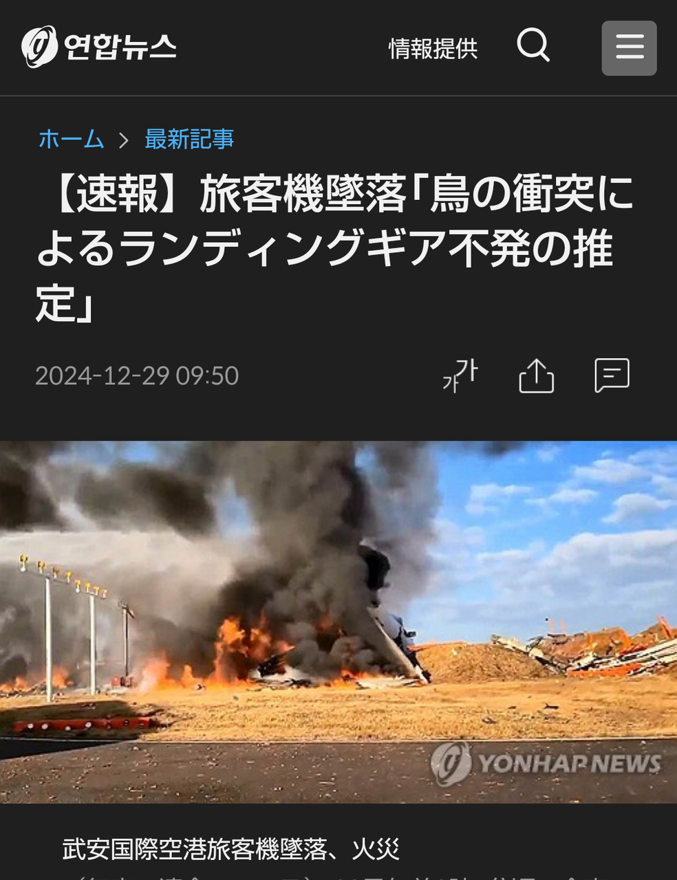【速報】韓国・務安空港で済州航空機が壁に衝突し爆発 28人死亡
