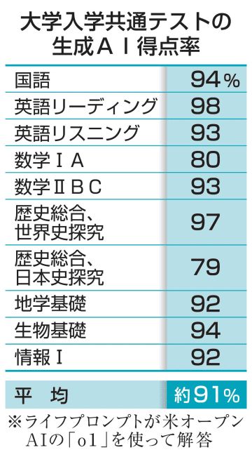 18、19日実施の大学入学共通テストを生成人工知能(AI)に解かせると、得点率は約91%になったと、AIベンチャーのライフプロンプト(東京)が20日、明らかにした。東大文科1類の受験生の多くが選択すると予想される科目を対象にした。