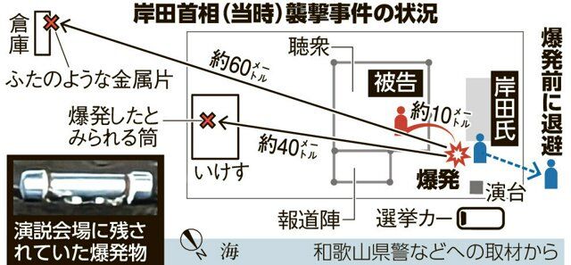 起訴状などによると、木村被告は22年11月以降に、兵庫県川西市の自宅などで火薬と二つの「パイプ爆弾」を自作。和歌山市に移動すると事件当日、うち一つを演説会場にいた岸田氏に向けて投げ込んで爆発させ、聴衆と警察官の計2人に軽傷を負わせたとされる。