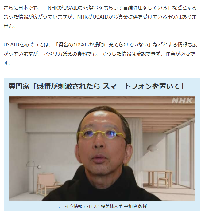 さらに日本でも、「NHKがUSAIDから資金をもらって言論弾圧をしている」などとする誤った情報が広がっていますが、NHKがUSAIDから資金提供を受けている事実はありません。