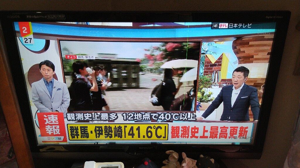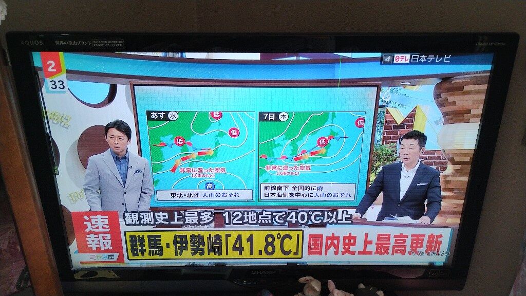 きょう(火)も、東・西日本は危険な暑さが続き、とくに関東の内陸で著しい高温となっている。午後2時半前、伊勢崎(群馬)で41.8℃を観測し、全国歴代1位記録を更新した。7月30日(水)に柏原(兵庫)で41.2℃を観測してから、1週間も経たないうちに、再び全国における高温記録を塗り替えたことになる。