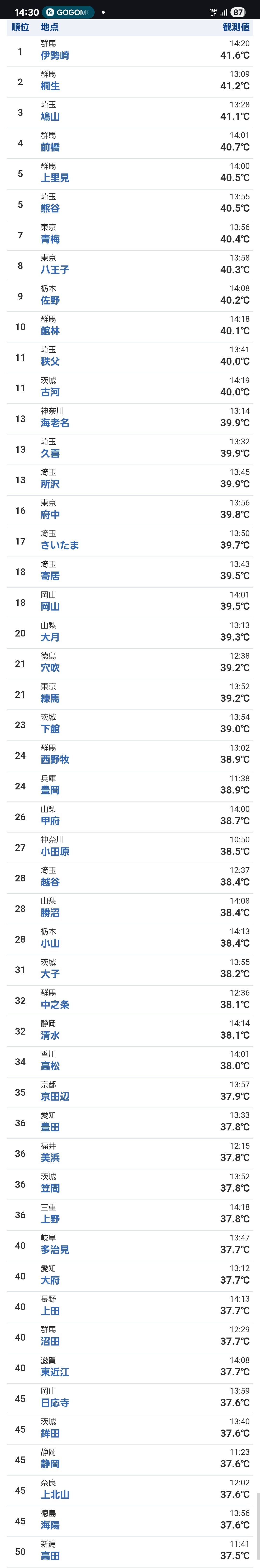 1 伊勢崎(群馬県) 41.8℃ 14:26