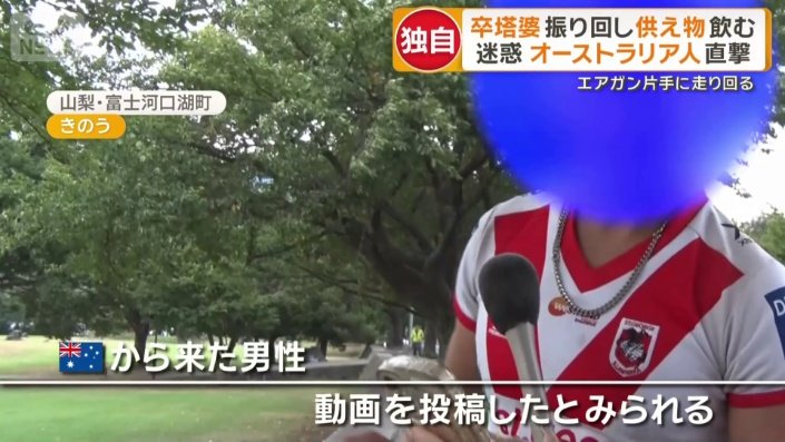 | 墓地で卒塔婆振り回し…迷惑オーストラリア人男性の配信に批判殺到し大使館が異例の注意喚起 山梨・富士河口湖町 …荒らす外国人男性の姿を映した動画。今、SNSで批判が殺到し、在日オーストラリア大使館が異例の注意喚起を行う事態となっている。 「卒塔婆」振り回し…外国… (出典:FNNプライムオンライン) |