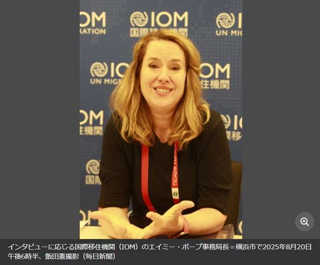 アフリカ開発会議(TICAD)に出席するため訪日中の国際移住機関(IOM)のエイミー・ポープ事務局長が20日、横浜市内で毎日新聞の取材に応じた。少子高齢化と深刻な労働力不足に直面する日本と、若年層の雇用創出が課題のアフリカ諸国のニーズは一致していると述べ、「働き手の公正な待遇と報酬を確保し、コミュニティーの一員として参加できる環境を整えることが不可欠だ」と訴えた。