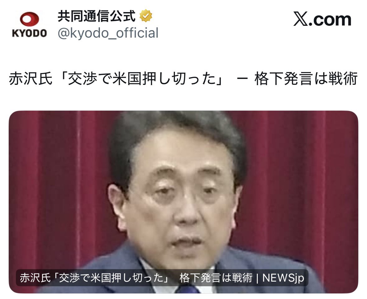 赤沢亮正経済再生担当相は9日の閣議後記者会見で、対米関税交渉について「関税より投資(の立場で)一貫して最後まで米国を押し切った」と述べ、一定の成果を得たとの認識を示した。日本だけが米国からの関税引き下げ要求に応じなかったとも主張。トランプ大統領との会談後に「私は格下も格下」と発言したのは交渉戦術だったと明かした。
