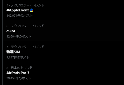 もし現在SIMカードのみに対応しているプランを利用している場合も、Airや17シリーズは利用できないため、プラン変更が必要になる可能性がある。Appleによる発表時間の10日未明(日本時間)には、早速「SIM」「eSIM」といったワードがXの日本のトレンド上位に。「スマホを17やAirに買い換えたいが、SIMカードからeSIMの移行が不安」などとする意見も散見された。