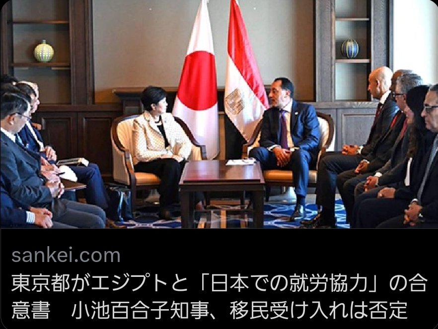 東京都はエジプト経済界との間で、エジプト人労働者の日本での雇用に関する合意書を結んだ。エジプト人労働者の就労で協力することが明記されており、事実上の移民受け入れにつながるとの指摘もある。小池百合子知事は移民受け入れを否定している。