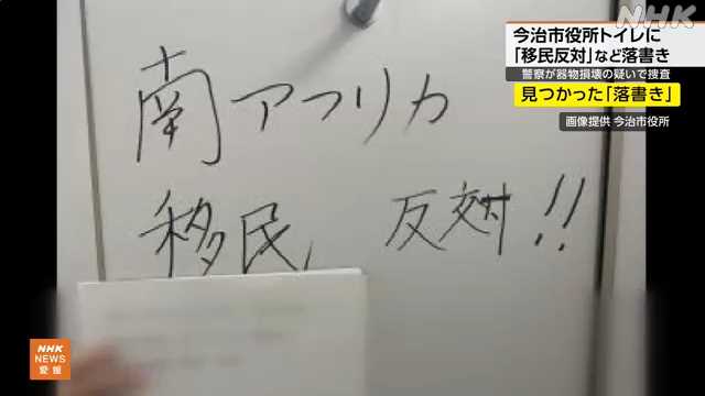 さらに、10日午後2時前には第1別館2階の女子トイレの個室の扉の内側に「移民反対白紙にしろ」という落書きが見つかり、市では警察に被害届を提出したということです。