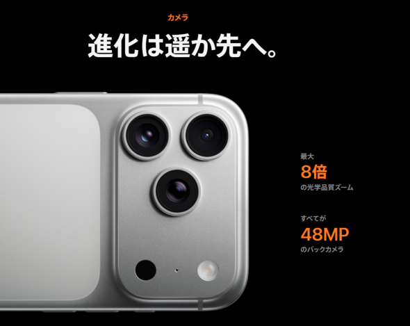 Appleが「iPhone 17 Pro/Pro Max」のアウトカメラに搭載した望遠レンズの日本語表現について「誤解を招きかねないのではないか」という指摘が相次いでいた問題で、同社が日本語公式サイト上の表記を「最大8倍の光学ズーム」から「最大8倍の光学品質ズーム」に修正したことが分かった。