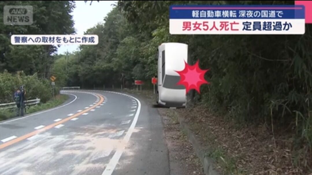 事故は3日未明に発生した。軽乗用車は山あいの右カーブを走行中、縁石に接触しながら電柱に衝突。乗っていた6人は、横転した車の近くの路上で通行人に発見された。いずれも名張市内に住む16~23歳の男女5人が死亡し、16歳の男子高校生が重傷を負った。県警は運転者や座っていた位置の特定に向け、5人の司法解剖などを進めている。