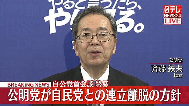 26年の連立関係が決裂危機にあった自民党と公明党の党首会談が10日午後に行われた。終了後に公明・斉藤鉄夫代表が「自公連立政権については一旦白紙とし、これまでの関係に区切りをつけることとしたいと思います」と「連立離脱」を表明した。