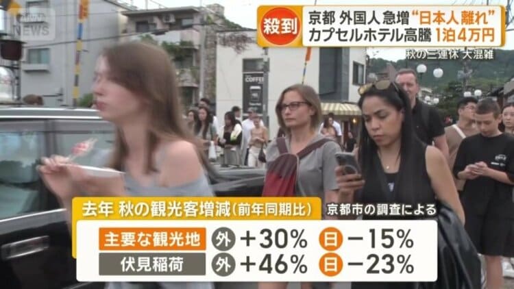 京都市が秋に調査した観光客の推移では、主要な観光地で外国人客が30%増えているのに対し、日本人客は15%減少しています。伏見稲荷に関しては、外国人客が46%も増加。日本人客は23%減少という結果になりました。