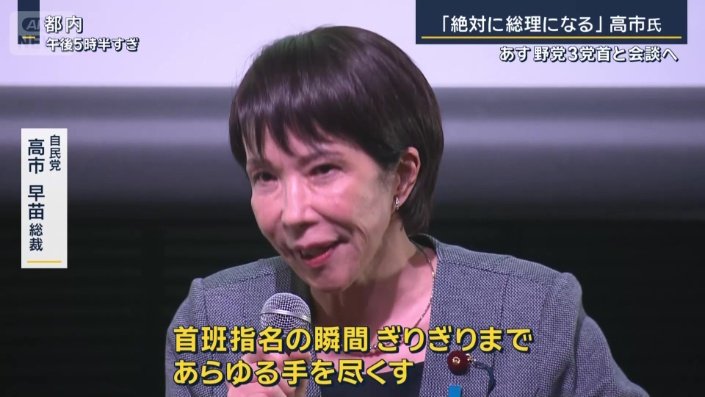 | 高市早苗氏「自民党の総裁にはなったけど総理にはなれないかもしれない女、と言われている“かわいそうな”高市早苗です」講演会で語った心境とは? …理のまま目先の懸案をきちんと処理して、少し落ち着いた段階で首班指名を改めて行ってその時に高市総理になる。そういう“時間差”を置いて対応することも一案」と話していた。 (出典:ABEMA TIMES) |