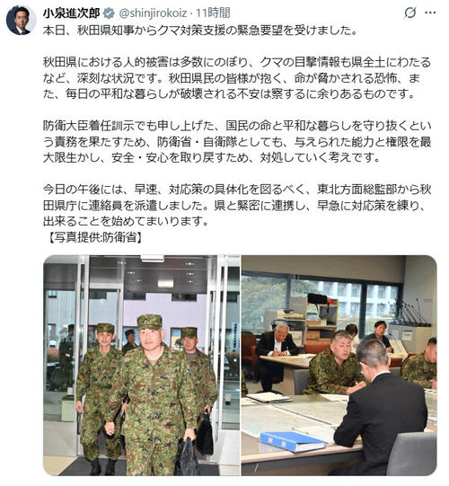 小泉進次郎防衛大臣は2025年10月28日、秋田県知事からクマ対策支援の緊急要望を受け東北方面総監部から秋田県庁に連絡員を派遣したと公式Xで発表しました。その際に投稿した写真が、ネットで大きな話題となっています。