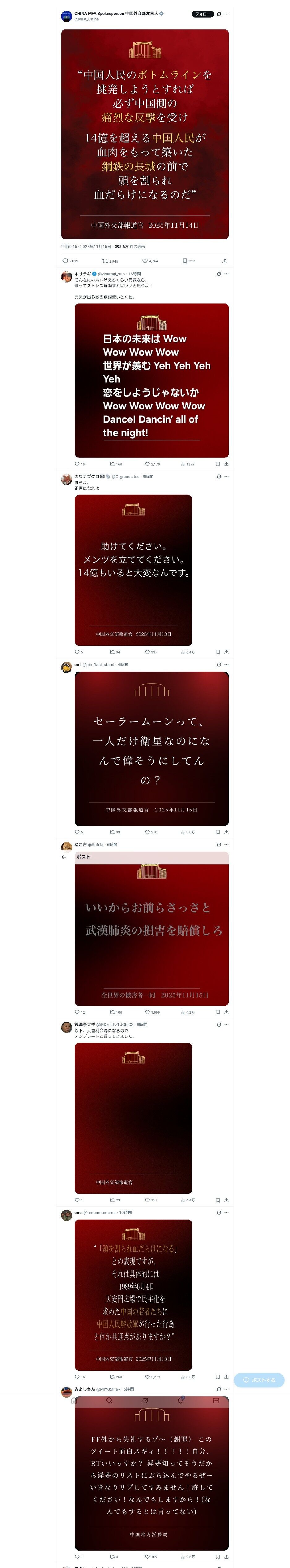 高市早苗首相が国会予算委で、台湾有事の最悪ケースを想定して「存立危機事態になり得る」と発言し、これに中国側が抗議している件で、中国軍の広報X(ツイッター)には、日本を非難する激しい文言が投稿されている。