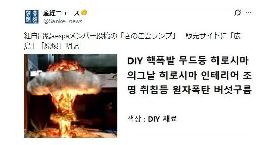 31日の「第76回NHK紅白歌合戦」に初出場が決まった韓国の4人組女性グループaespa(エスパ)のメンバーが過去に原爆のきのこ雲をイメージしたランプの写真を投稿していた問題で、韓国インターネット通販大手のサイトに、同一とみられる商品が「核爆発」「広島」「原子爆弾」などと明記されていることが分かった。NHKの「原爆を揶揄する意図がなかった」との説明に疑問が出ている。