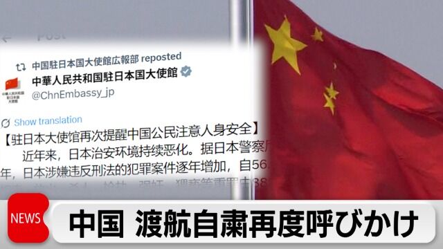 日本にある中国大使館は「日本の一部地域では治安情勢が不安定だ」と主張し、中国国民に対し日本への渡航を控えるよう改めて呼びかけました。