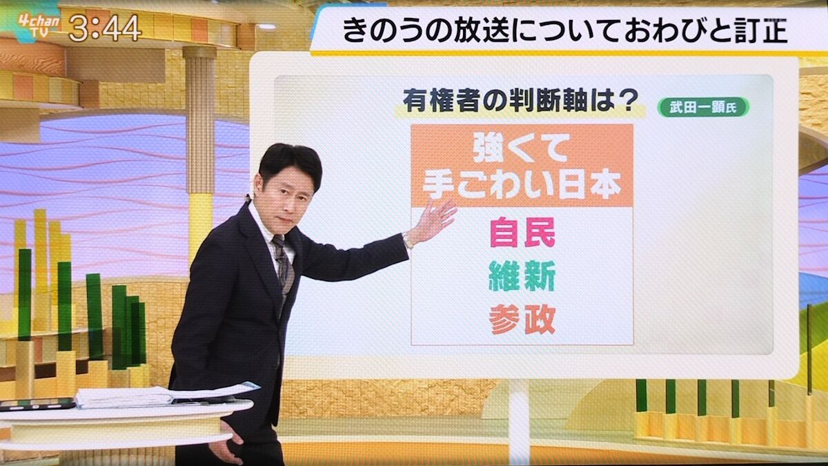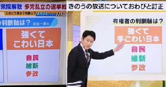 さらに「強くて手ごわい日本 自民、維新、参政」という画面を表示したうえで「きのうは『強くてこわい日本』という表記になっていました。これが大変不適切で、しかも武田さんが意図するものとちょっとニュアンスが違っていました。『手ごわい日本』と武田さんは伝えたかったということです」と事情を明かした。