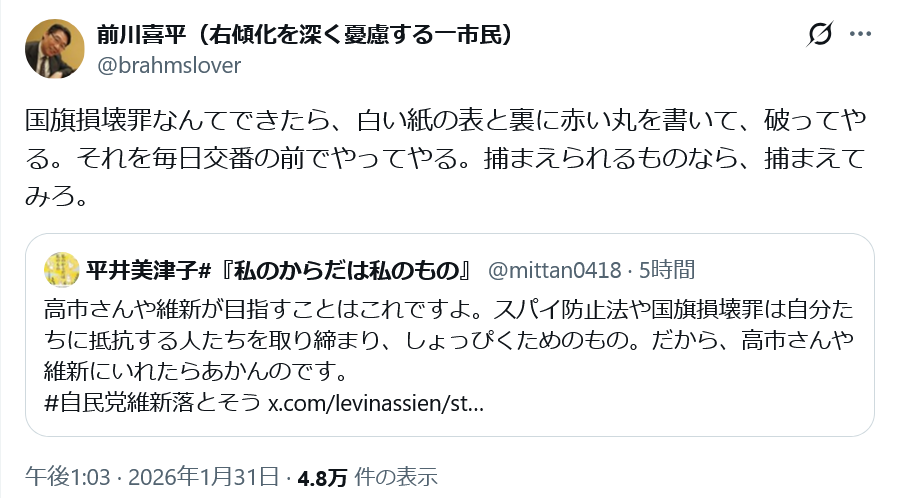 国旗損壊罪なんてできたら、白い紙の表と裏に赤い丸を書いて、破ってやる。それを毎日交番の前でやってやる。捕まえられるものなら、捕まえてみろ。
