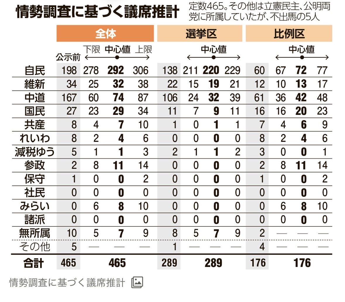 2月8日投開票の衆院選(定数465)について、朝日新聞社は1月31日から2月1日にかけ、約37万人を対象に電話とネットによる調査を実施し、取材情報も加えて中盤情勢を探った。(1)自民党は単独で過半数(233議席)を大きく上回る勢いで、日本維新の会とあわせて与党として300議席超をうかがう(2)中道改革連合はふるわず、公示前勢力(167議席)から半減する可能性もある(3)国民民主党はほぼ横ばい(4)参政党、チームみらいが躍進――などの情勢となっている。