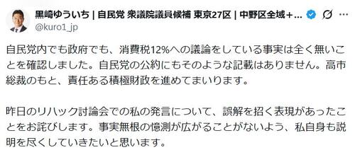 | 【衆院選】玉木雄一郎氏出演リハック「消費税12%」よりMCが驚いた自民の消費税議論が話題に …ゆういち)氏がReHacQ出演の際、政権内で「消費税12%」の議論があるか、との問いに「(消費税12%の話が)来てないわけではありません」と一度は発言… (出典:日刊スポーツ) |