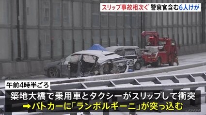 スリップ事故相次ぐ ランボルギーニがパトカーに突っ込むなど車7台関係する事故 警察官2人含む6人けが 東京・築地大橋|TBS NEWS DIG