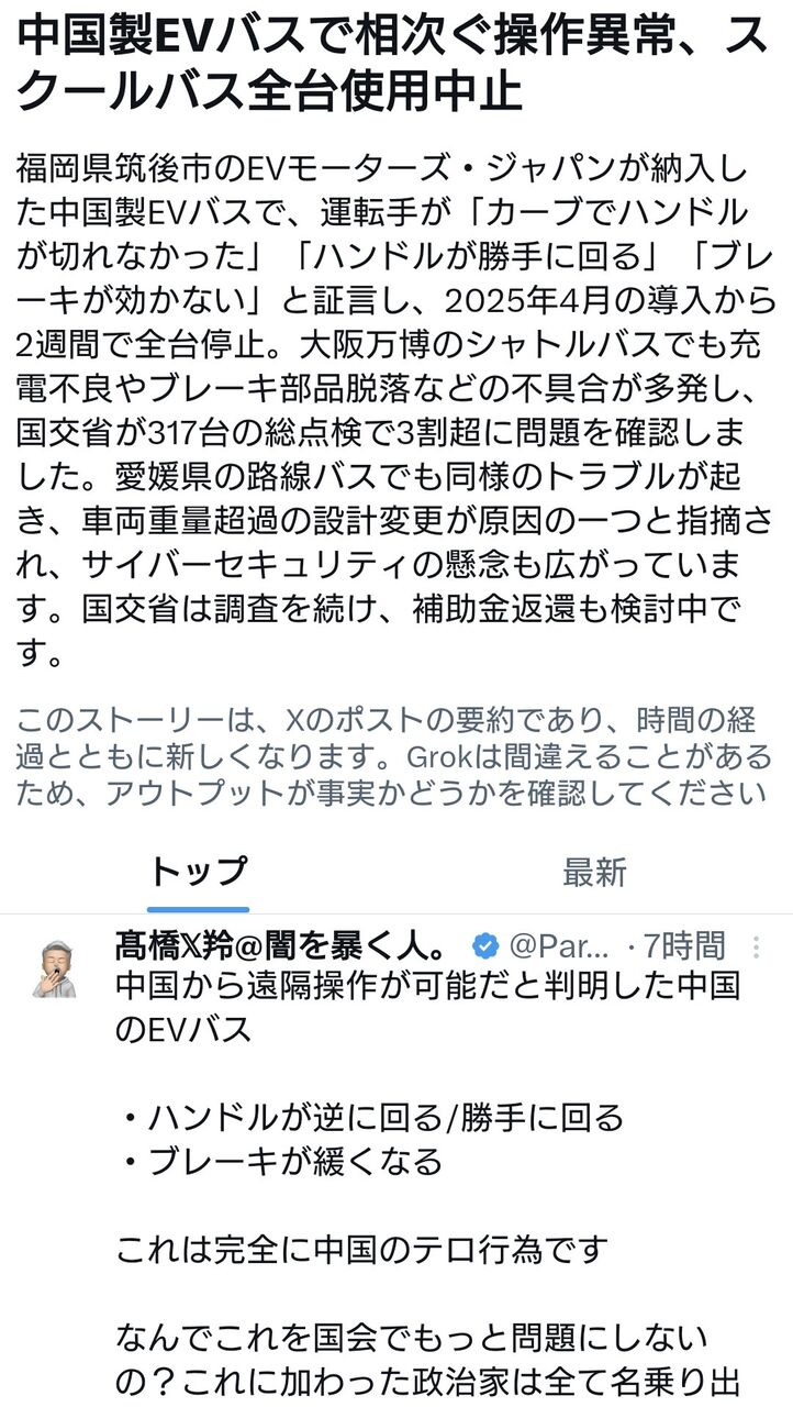 北九州市のEVMJが中国メーカーに委託製造したEVバスで、ハンドル逆回転やブレーキ不具合が317台中約3割に発生。大阪万博で190台導入されたがトラブル続き、国交省は2025年11月に全台点検を指示した。福岡のEVスクールバスではカーブ不反応などが頻発し、運転手が「労労がすごかった」と証言。X上で遠隔操作テロの懸念が高まり、公明党や維新への批判も目立つ一方、ノルウェー事例を根拠とするが日本での具体例は未確認だ。