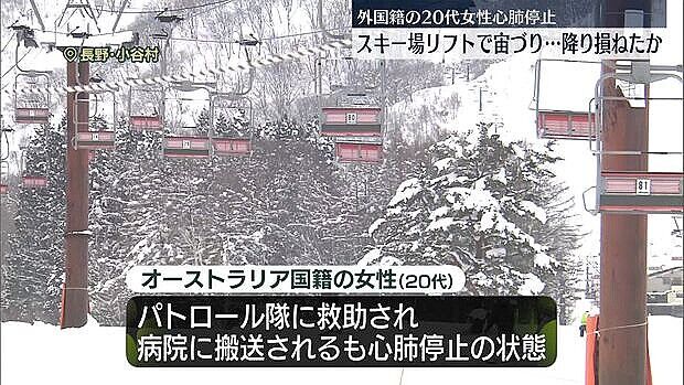 | リフト宙づり、豪女性が意識不明 長野・小谷村のスキー場 30日午前9時ごろ、長野県小谷村のスキー場「つがいけマウンテンリゾート」で、オーストラリア国籍の20代女性がリフトから宙づりになる事故があった。女… (出典:共同通信) |