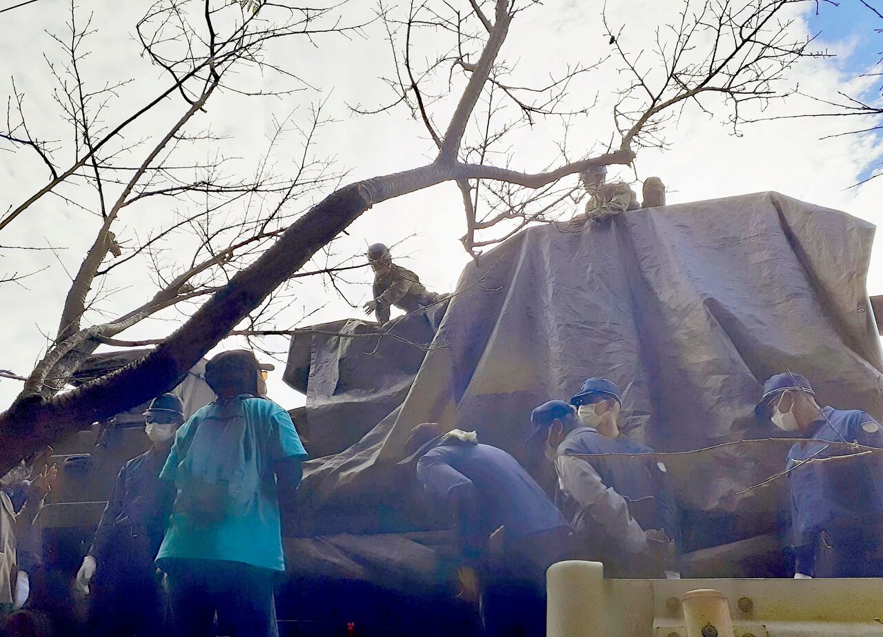 沖縄県本部町の八重岳で26日、訓練予定地の山頂方向に向かっていた自衛隊の大型車両が沿道の桜並木を車体に引っ掛け、枝を折った。本部署が物損事故として処理し、その後に訓練は中止された。自衛隊統合演習に伴う通信訓練などを目的に、29日まで本部町所有の草地を使用する予定だった。